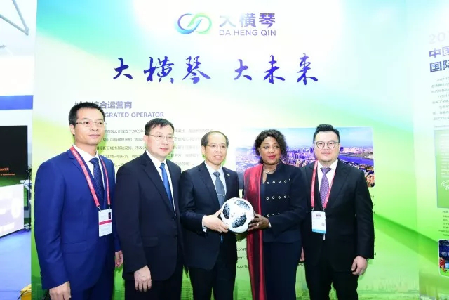 (圖:中國足協常務副主席兼秘書長張劍(中),國際足聯秘書長法瑪特(右2),市委常委郭才武(左2)親臨大橫琴展臺視察指導。)