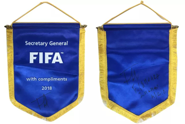 (圖:國際足聯秘書長法特瑪·薩姆拉贈送親筆簽名的國際足聯會旗)