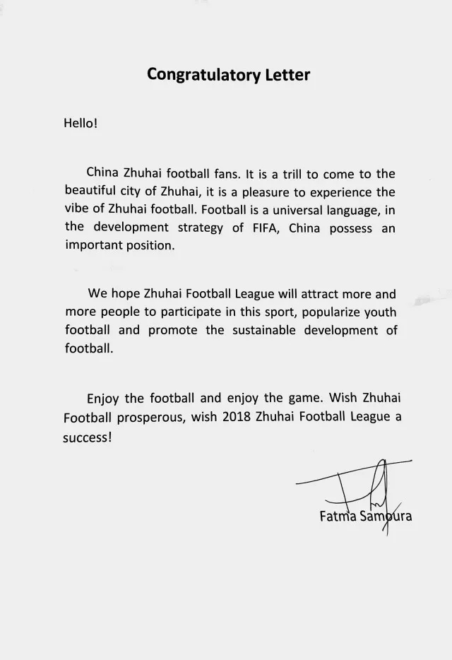 法特瑪·薩姆拉在信中表示,足球是世界通用語言,在國際足聯的足球發展戰略中,中國占有重要的地位。期待珠海市足球聯賽能夠吸引越來越多的人參與到足球這項運動中來,廣泛普及青少年足球運動,促進足球的可持續發展。當天上午,soccerex全球足球產業峰會在會展中心舉行,法特瑪·薩姆拉還向主辦方珠海大橫琴投資有限公司贈送親筆簽名的國際足聯會旗。