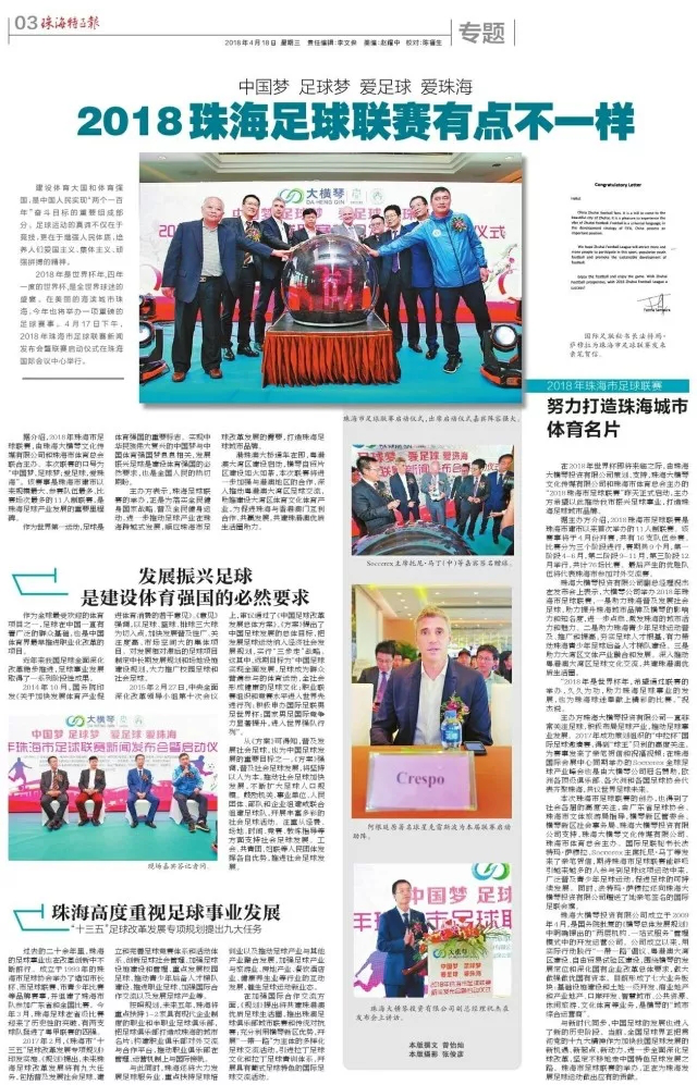2018年是世界杯年,四年一度的世界杯,是全世界球迷的盛宴。在美麗的海濱城市珠海,今年也將舉辦一項重磅的足球賽事。4月17日下午,由珠海大橫琴投資有限公司策劃、支持,珠海大橫琴文化傳媒有限公司和珠海市體育總會主辦的“2018珠海市足球聯賽”昨天正式啟動,希望以此推動珠海市足球事業發展,打造珠海足球城市品牌。soccerex主席托尼·馬丁,阿根廷前國家隊隊員、傳奇球星克雷斯波,廣東省足球協會副主席、廣東足球運動中心主任程志文,廣東省政協委員、澳門中華總商會青年委員會主任馬志達,珠海市文化體育旅游局副局長鄔向明等出席了發布會并共同見證了聯賽啟動。