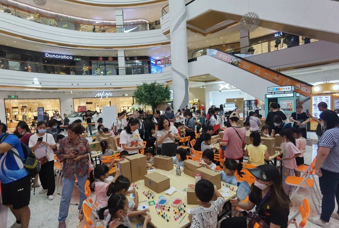 5月26日下午,鳳山街道在金發購物中心一樓中庭開展“讓垃圾分類成為新時尚”紙箱繪畫創作課堂,共有約220余名居民參與。