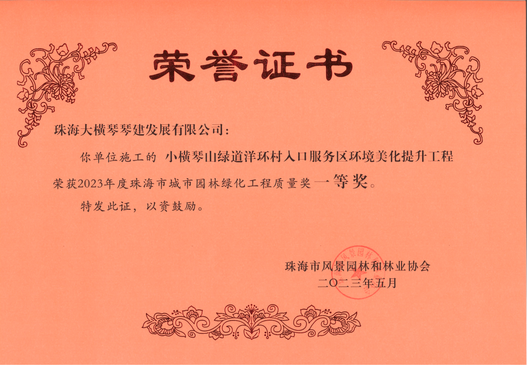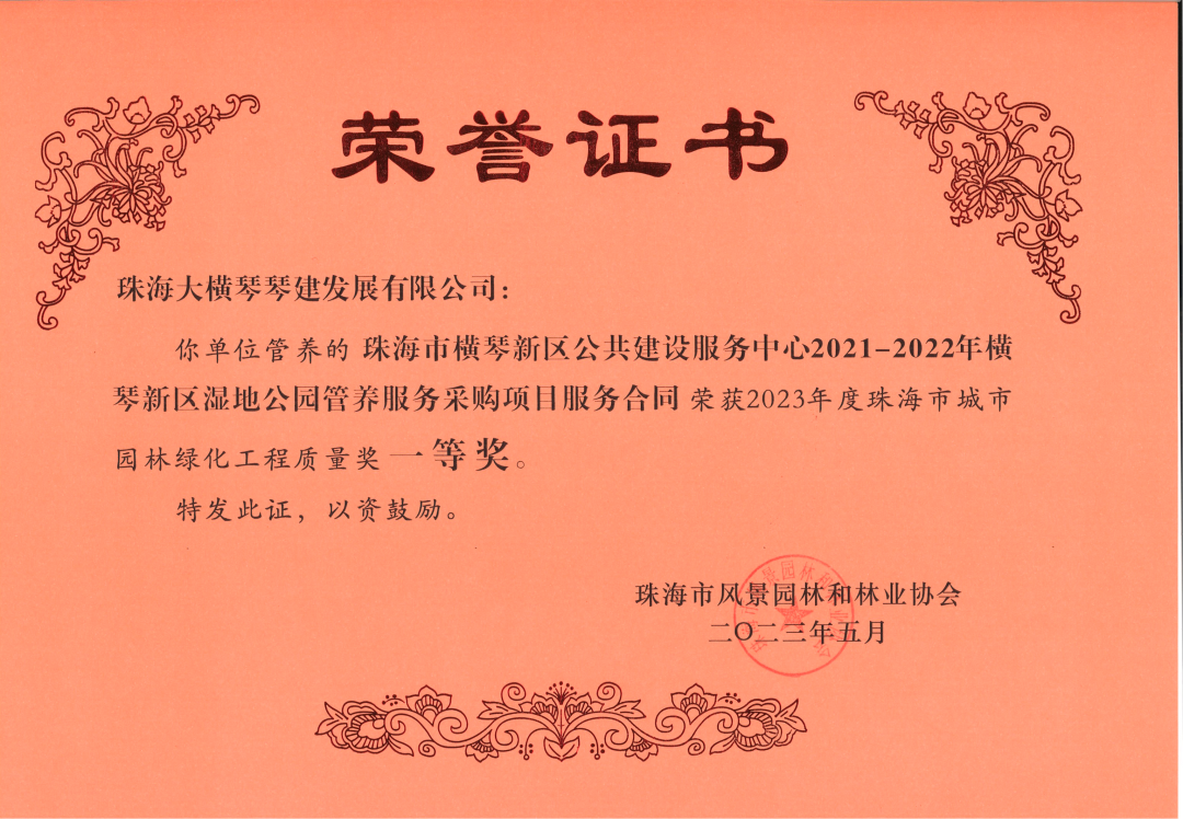 近日,珠海大橫琴琴建發展有限公司、珠海市橫琴新區公共建設服務中心,2021-2022年橫琴新區濕地公園管養服務采購項目服務合同,小橫琴山綠道洋環村入口服務區,環境美化提升工程,以及作為代建單位負責建設的古樹名木公園(粗沙環)項目,榮獲由珠海市風景園林和林業協會頒發的2023年度珠海市城市園林綠化工程質量獎一等獎。