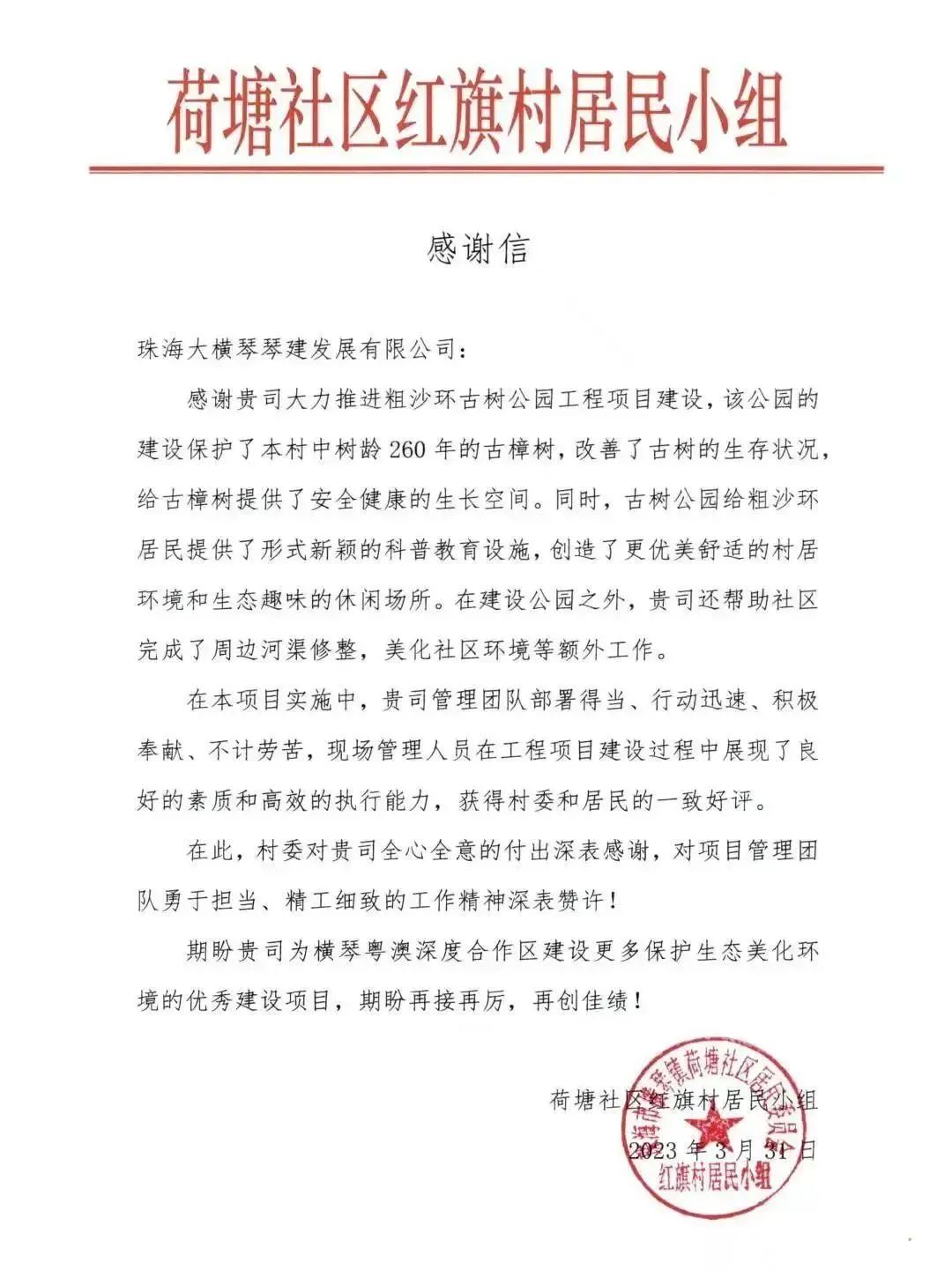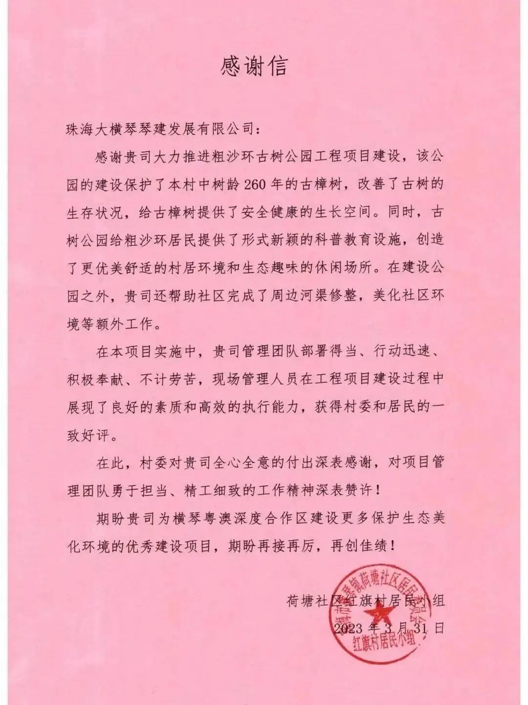 古樹公園的建成改善了周邊村居環境,也得到了附近村民的喜愛。荷塘社區紅旗村居民小組還給琴建公司發來了感謝信。