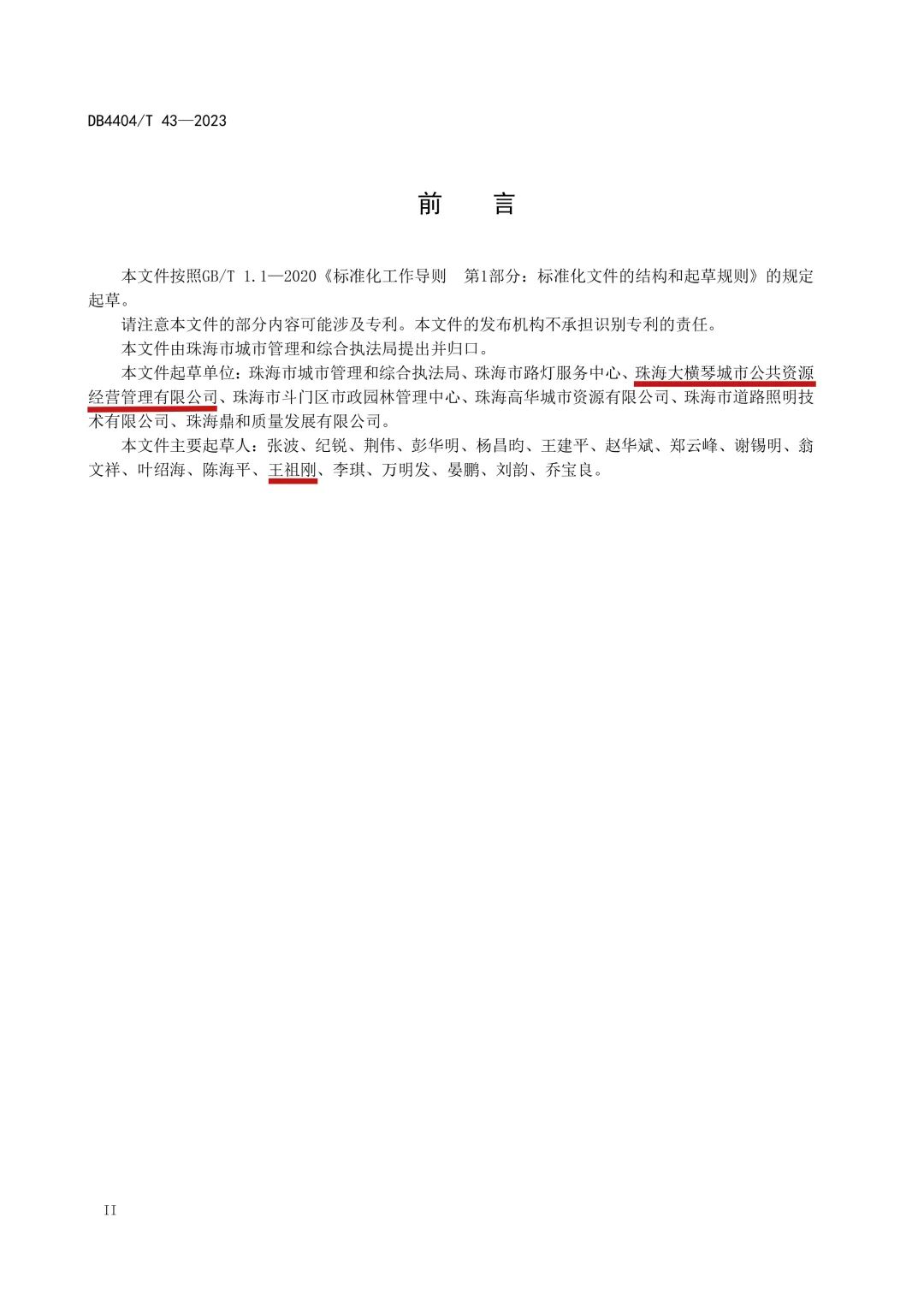 大橫琴城資作為標準編制單位之一、大橫琴城資市政設施部副總監王祖剛作為標準主要起草人之一,積極參與標準制定工作,助力構建系統高效的城市照明體系。