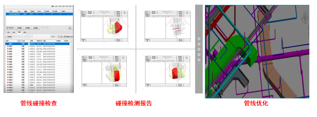 對(duì)綜合樓區(qū)域的機(jī)電模型進(jìn)行專(zhuān)業(yè)間的碰撞檢測(cè),導(dǎo)出碰撞檢測(cè)報(bào)告并進(jìn)行分析,結(jié)合圖紙會(huì)審結(jié)果,進(jìn)行機(jī)電管線(xiàn)綜合優(yōu)化。本次項(xiàng)目共優(yōu)化329余處,解決機(jī)電碰撞點(diǎn)329處,解決凈高問(wèn)題53處。