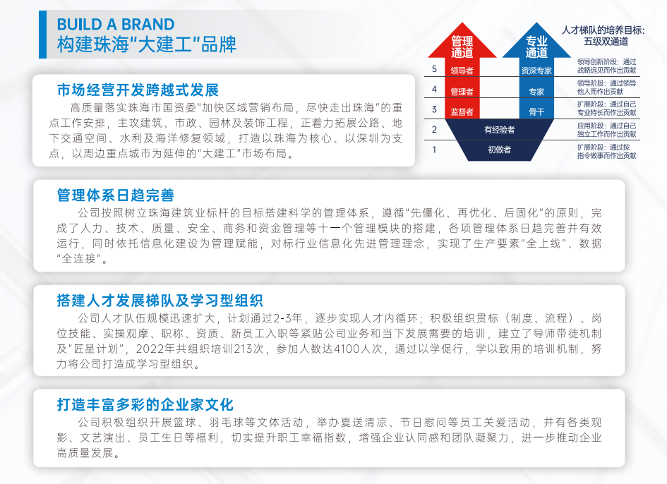 珠海建工集團自正式運營以來,通過短短兩年時間的精心謀劃、積極應對、主動作為,業務承攬量實現了從拾億級到百億級的突破,主要經營業績實現了質的提升,資產規模和人才隊伍也呈十倍級地迅速壯大,更榮獲了“AAA信用企業”、“高新技術企業”等一項項殊榮。也在高質量發展的征程中,錘煉鍛造了一支堪當重任的干部隊伍。
