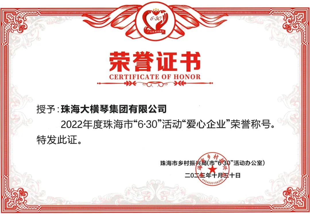 為深入貫徹黨的二十大和中央農村工作會議精神,落實市委、市政府關于統籌實施鄉村振興戰略和“百縣千鎮萬村高質量發展工程”工作部署,匯聚更多社會力量參與“6·30”活動,鞏固脫貧成果、助力鄉村振興、促進共同富裕,根據《中共珠海市委農村工作領導小組〈關于印發珠海市2023年“6·30”助力鄉村振興活動工作方案〉的通知》(珠委農組〔2023〕6號)精神,市鄉村振興局(市6·30活動辦)開展2022年度珠海市“6·30”活動“愛心企業、愛心團體、愛心個人”評選活動,向社會傳遞珠海人民樂善好施的精神品德,激發社會各界共襄善舉、助力鄉村振興。經評審,珠海大橫琴集團有限公司(以下簡稱大橫琴集團)被授予2022年度珠海市“6·30”活動“愛心企業”榮譽稱號。