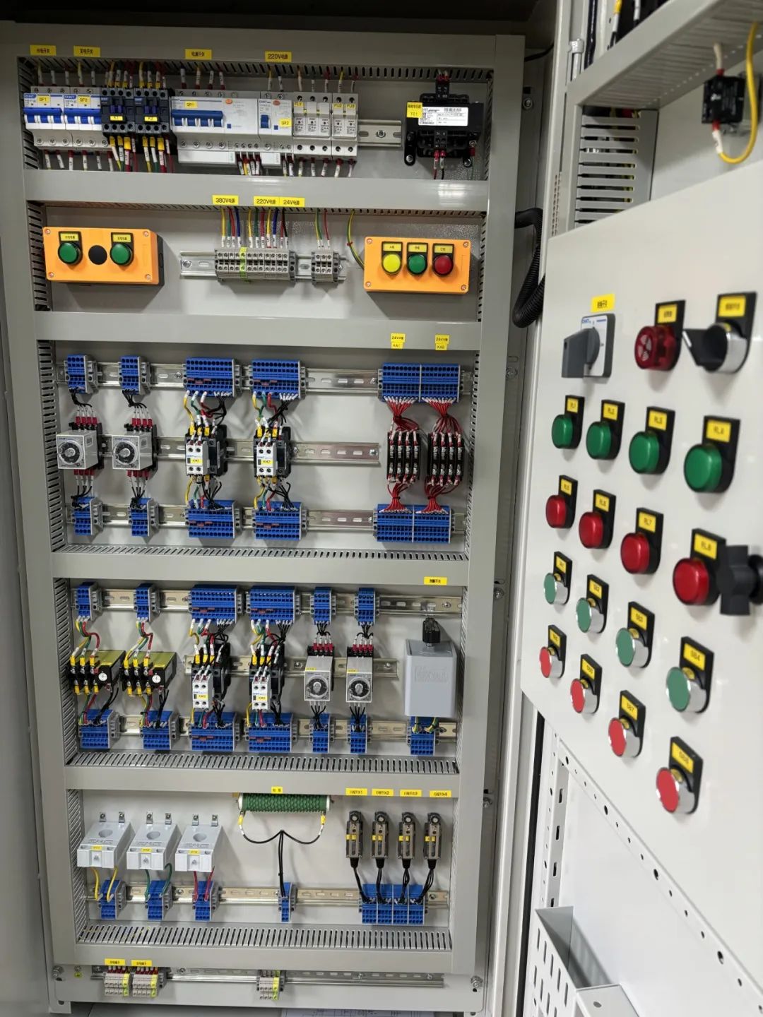培訓室內配套設置了4臺PLC教學版智能自動控制模板、4臺成品動力柜、4臺成品照明柜、4套直流電機調速控制線路、5套三相電機正反轉接線設備、5套三相水泵浮球控制設備及各種適用于初級、中級機電認證高端設備。未來,該培訓室將開放給公司機電業務線條員工日常訓練使用,有助于員工培養“執著專注、精益求精、追求進步”的工匠精神。