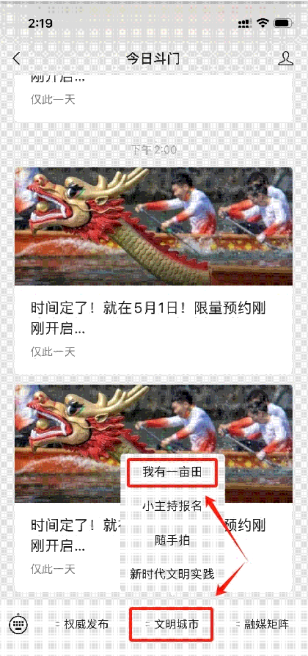 1.進入“今日斗門”公眾號,點擊"文明城市",選擇"我有一畝田"進入預約小程序,點擊“預約”后,按照您的理想時間,選擇相應時間段。