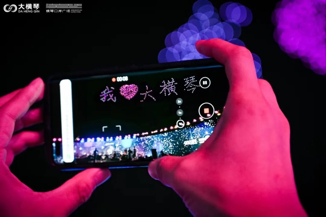 當晚,橫琴口岸正上空,還演繹了一場點亮夜空、打破傳統的星空大秀。一架架無人機排著整齊的隊列,在夏日的夜空里亮起了點點星光。機群盤旋上升匯聚,在空中先后編織出“我愛橫琴”、“25”、“金蓮花”等一個個絢麗的方陣,在夜空中留下了一個個美好的祝福,而在場的觀眾也隨著無人機方陣的變化,許下對琴澳協同發展的美好期許。