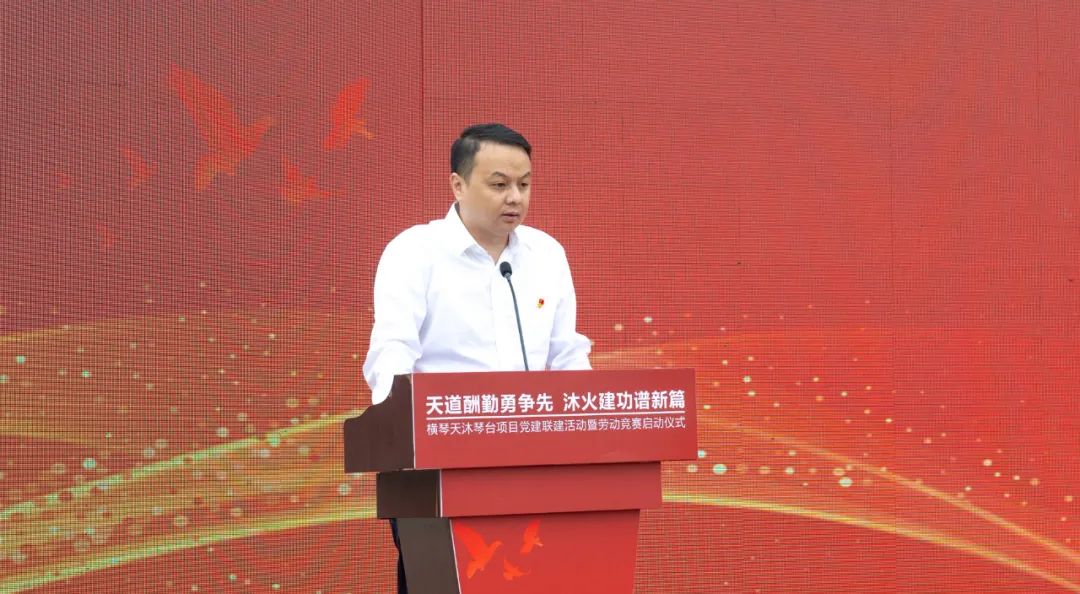 3月28日,由大橫琴置業(yè)投資建設(shè)的橫琴天沐琴臺項(xiàng)目舉辦黨建聯(lián)建暨勞動競賽啟動儀式。廣東省委橫琴工委黨建工作處處長童鐵丁,珠海市總工會黨組書記、常務(wù)副主席唐尚洪,橫琴粵澳深度合作區(qū)行政事務(wù)局黨支部書記、副局長張文驥,橫琴粵澳深度合作區(qū)城市規(guī)劃和建設(shè)局黨總支委員、住房保障處處長鄭慧仙,珠海大橫琴集團(tuán)有限公司副總經(jīng)理祝杰,珠海大橫琴置業(yè)有限公司黨總支書記、董事長唐文彬,中建八局華南分局黨委書記郭青松,各參建單位代表及工友代表約80人參加本次活動。