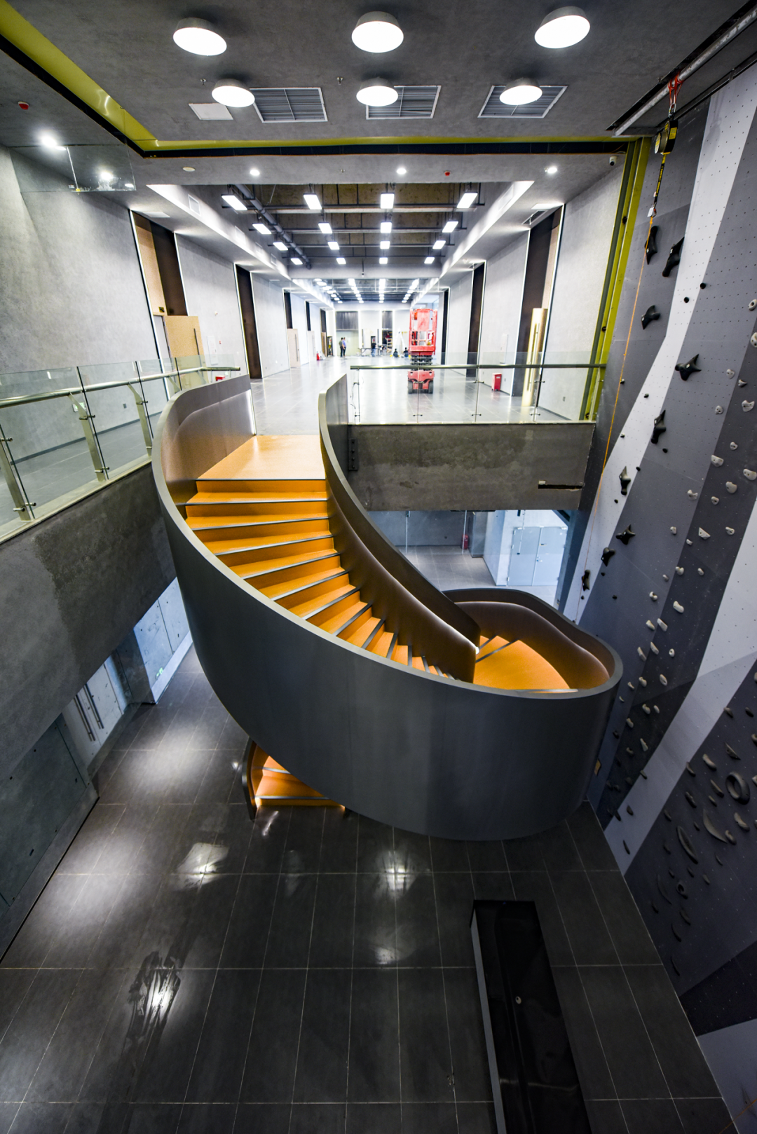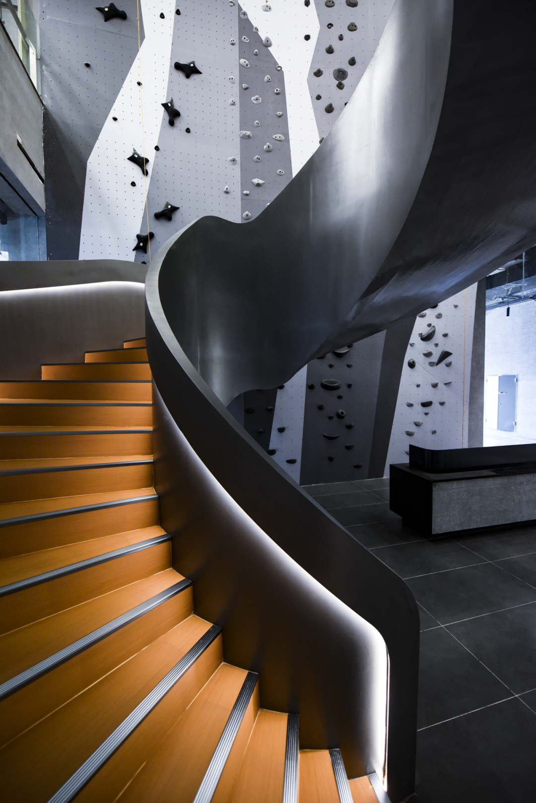 11樓設置了多功能室(可容納300人)、大小會議室、洽談室等,中庭與12樓相通,設置了旋轉樓梯和攀巖墻,寓意企業步步高升,體現企業家永攀高峰的精神。12樓主要以企業服務區、會客室為主。