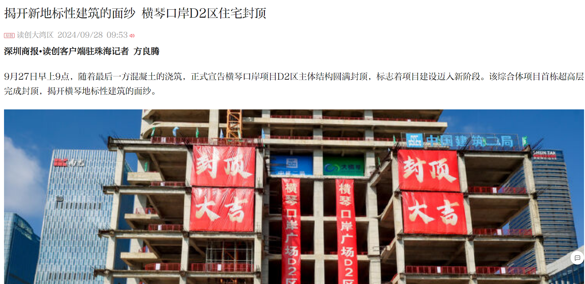 本次封頂的D2區住宅由珠海大橫琴口岸實業有限公司建設,位于橫琴口岸旅檢樓南側,為44層高,建筑高度約180米。D2區住宅總建筑面積約8.6萬㎡,其中1-6F為商業,7F架空層,8-44F為70年產權稀缺住宅。