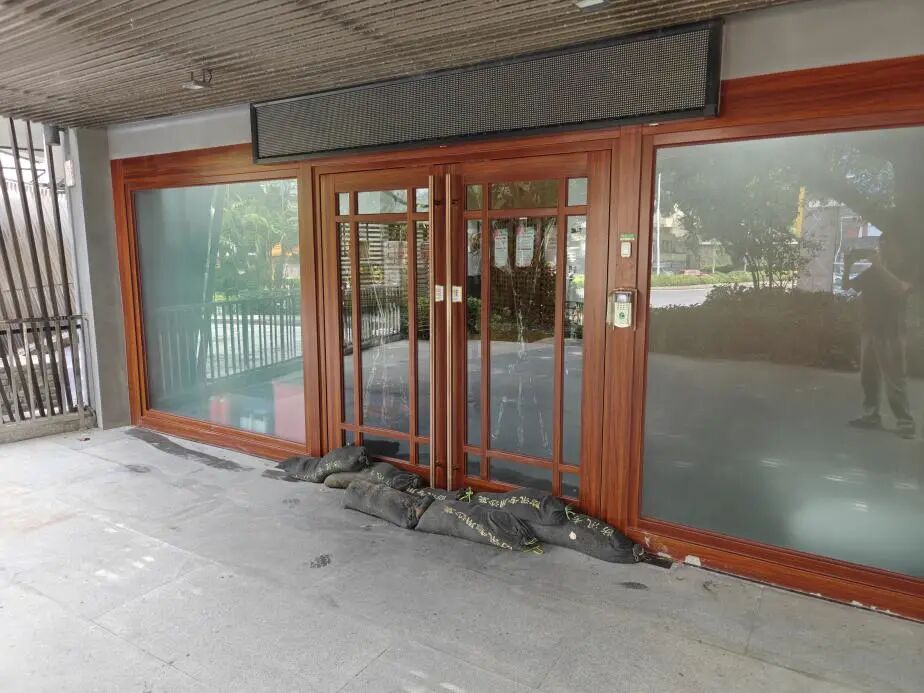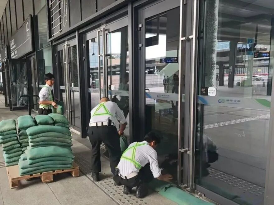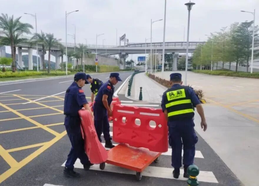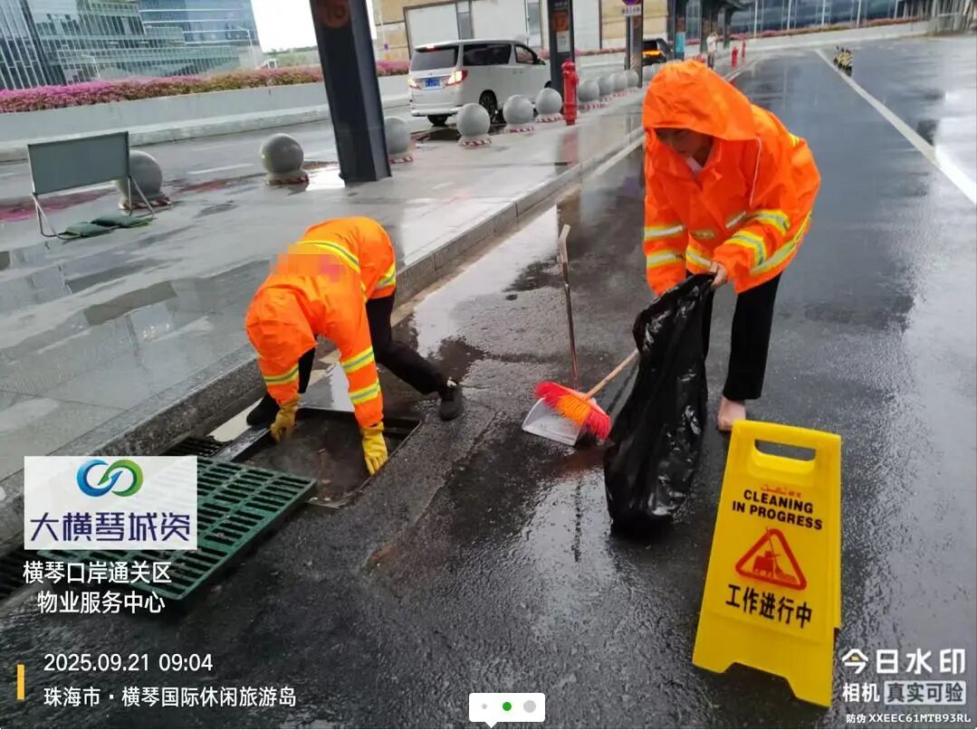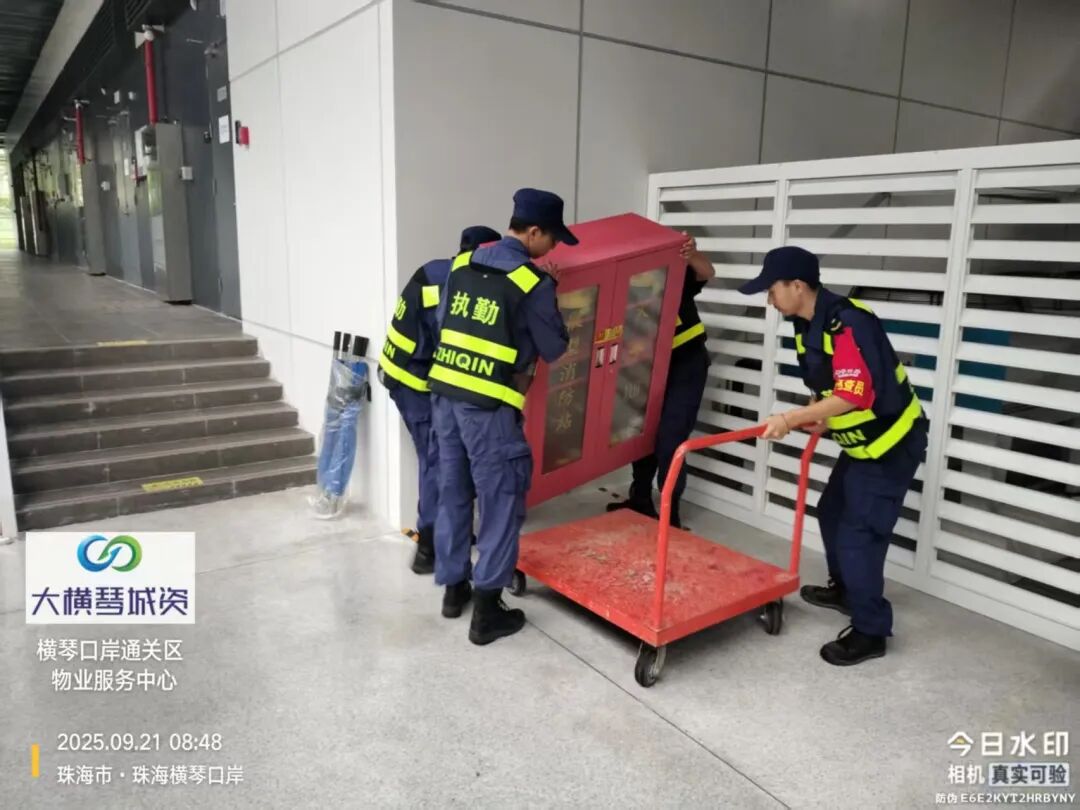 在橫琴口岸區域,提前排查200多個集水井,調集230個緊固件加固門窗,近3000條沙袋、近100個防洪擋板、11臺水泵等應對福臨道、地庫36處接駁口、負二層下沉庭院、U行車道等重點區域強排和封堵需要。同時對通關區域的100余扇玻璃門進行加固,在易水浸區域放置沙袋、擋板。同時,全面清理雨水井、排水溝渠,確保排水暢通。
